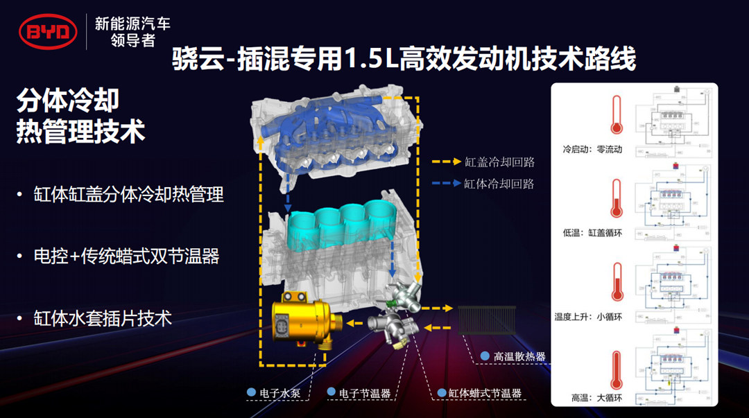 比亚迪DM-i使用的1.5L骁云发动机,使用了电子水泵和分体冷却技术。电子水泵就是用电机驱动的水泵,其转速与发动机的转速并不相关,所以在低转速高负荷的工况时,电子水泵依然能给发动机提供充足的冷却水。