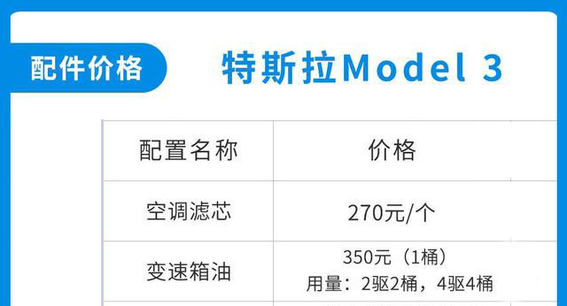 在保养方面纯电动车真的太省钱了,没有太多机械件需要养护之下,特斯拉Model 3基本2万公里保养一次即可, 大致的项目就更换空调滤芯(270元)、变速箱油(350元/桶)而已,所以基本小保养也只是900元左右(不含工时哦)。