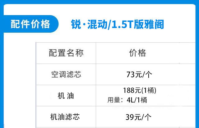 而锐·混动/1.5T版本田雅阁官方建议的保养里程就比较密,每5000公里就需要保养一次,基础项目就更换机油(188元/桶)、机油滤芯(39元)、空调滤芯(73元)等,综合费用就需要300元左右。