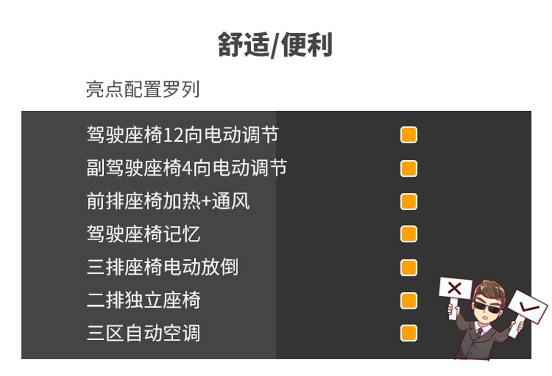 作为7座SUV,空间自然是最重要的。传祺GS8方正的造型之下,车内空间自然不会让人失望。前排和二排无论是头部、腿部空间还是座椅舒适度都让人满意。座椅本身非常柔软,但并不欠缺支撑。美中不足的是前排座椅通风效果欠佳,在大夏天刚上车的时候还是有点难受的。
