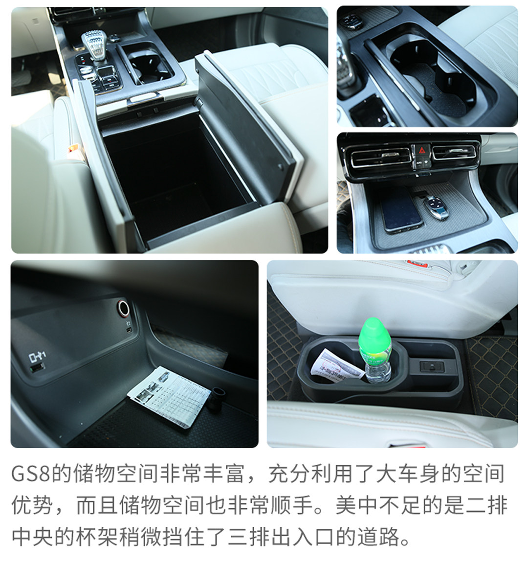 我认为GS8的主力买家不会太在意它的操控性能,所以GS8在操控上的瑕疵也不算是什么硬伤。我这里就简单提一下吧:转弯时车身反应比较慢,减震比较软,但在平直路面上车身还是相当安定的,另外方向盘虚位不小的。但对于把它当奶爸车的用户而言,都不算是什么缺点。