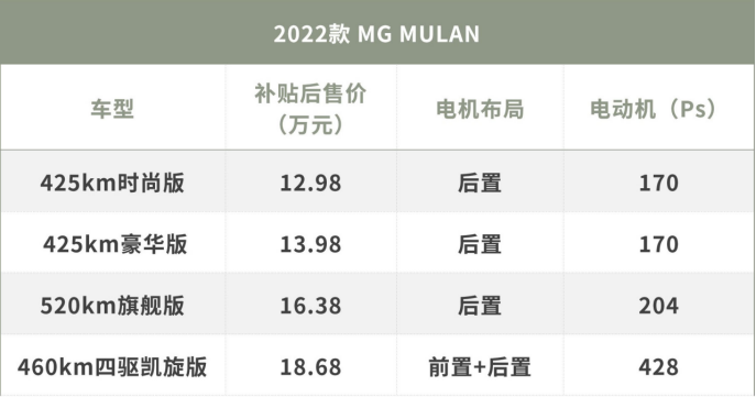 在这所有配置里面,售价为18.68万的顶配车型是我非常期待的,毕竟这台车不到20万的价格,就能买到3.8秒破百的动力了!并且是四驱布局!纵观目前市场,这绝对是超高性价比的体现。所以MG MULAN被叫“电动小钢炮”也是完全合理了。