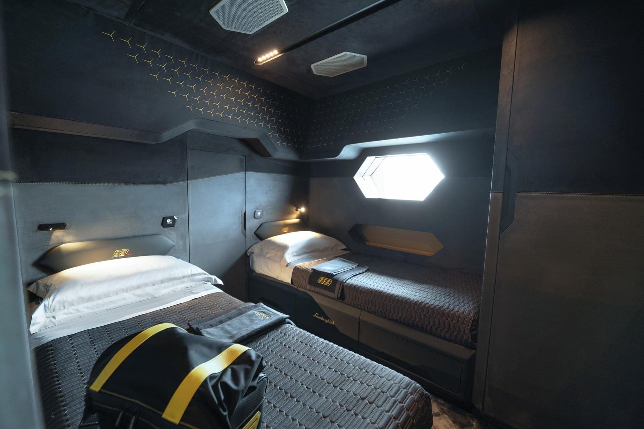 为了解决超级游艇上的生理需求,「Lamborghini 63」准备了几件套房,这是陆地上的兰博基尼不能比拟的地方之一。当你在甲板上享受足够的日光浴之后,不妨步入船内的房间与周公问声晚安。
