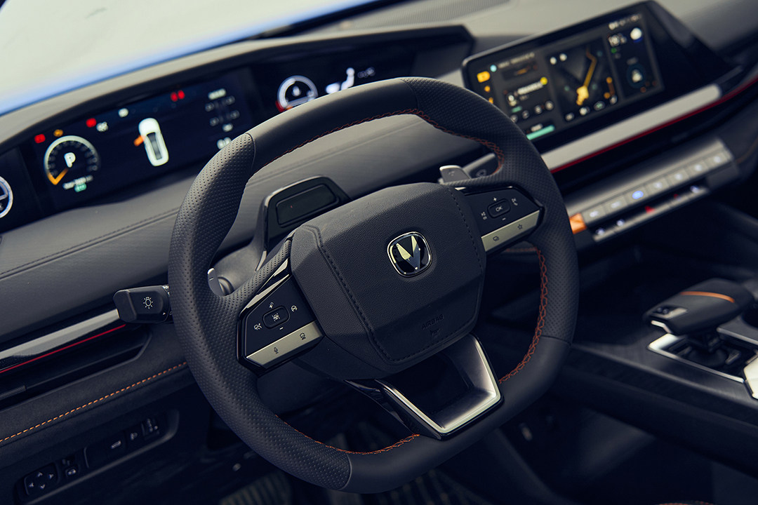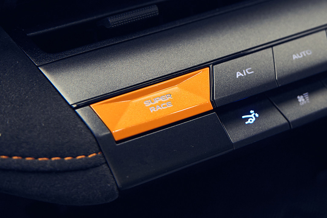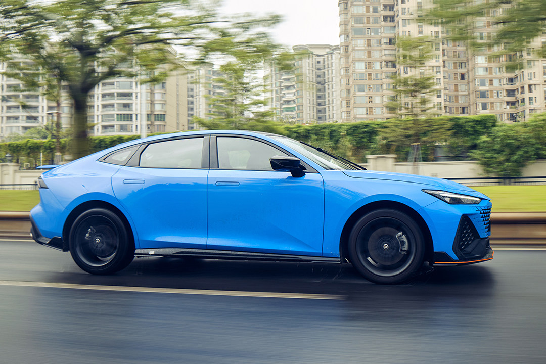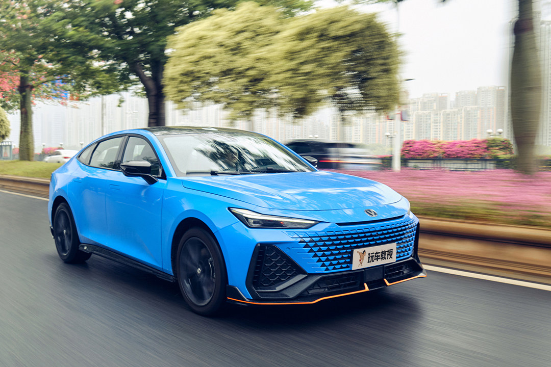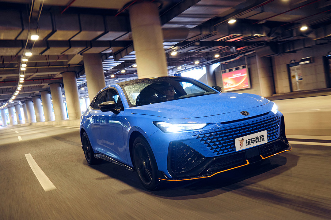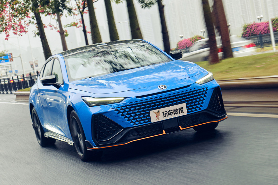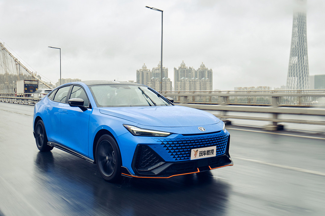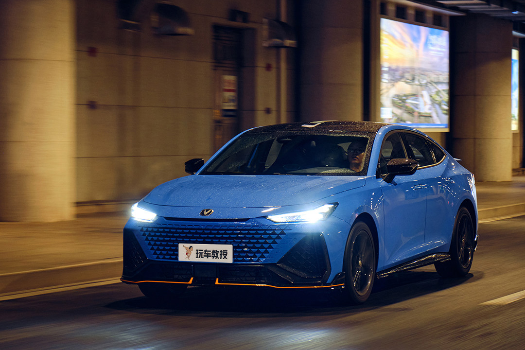 因为在发动机盖下,装载的是一台蓝鲸动力2.0T高压直喷发动机。从账面数据上看,这款发动机可以输出最高233匹马力与390牛·米扭矩,领先一众对手。在8AT手自一体变速箱的帮助下,账面上的动力参数被高效转化为实际的速度。每踩下一分油门,动力就增强一分;无论是在城市道路还是在高速道路,只要提出需求,2.0T发动机都能挤出令人印象深刻的动力帮助你提速、超车。这种澎湃的力量从起步到高速从未中断,给教授带来十足的自信;这就是蓝鲸动力2.0T发动机扎实的动力优势。而且这种强劲的动力还具备极强的适应性,它不会像某些硬核性能车那样在低速行驶时表现出频繁的顿挫,更不会因动力输出集中于高转区间而在低转速下变得乏力;相反,长安UNI-V在普通模式下可以提供非常称心如意的动力输出,起步动作轻柔,换挡也相当平顺舒适。事实上,由于起步响应同样及时,而中途加速性能也足以满足基本需求,教授甚至认为ECO模式就已经能应付城市道路上的大部分驾驶场景。这种适应性不仅归功于2.0T发动机自身强劲的动力性能,更离不开8AT手自一体变速箱。这款变速箱相比时下同类车型常见的双离合变速箱不仅成本更高,在换挡逻辑以及响应速度方面也要更加聪明、快速。当教授驾驶着长安UNI-V在城市道路上行驶时,8AT手自一体变速箱和大部分的同类产品一样积极地提升挡位,控制转速在经济范围。而无论何时何地,只要给出加速指令,变速箱都能非常及时地降低挡位,而整个过程行云流水,不会给驾驶者带来明显的干扰。假如教授按下了橙色的按键,激活“Super Race”模式,动力系统的工作逻辑将会更加激进;发动机怠速转速提升至2000rpm左右,从而带来更加敏捷的动力响应。除此之外,它甚至支持弹射控制系统,只需踩住刹车,油门到底,系统便会自动计算最佳起步设定,在松开刹车的瞬间一骑绝尘。毫无疑问,所有这些都是动力系统调校功力的绝佳展现。不过,作为一款运动化车型,单有动力性能是远远不够的;直线快可以靠力大砖飞,但弯道里快才算真正的快。