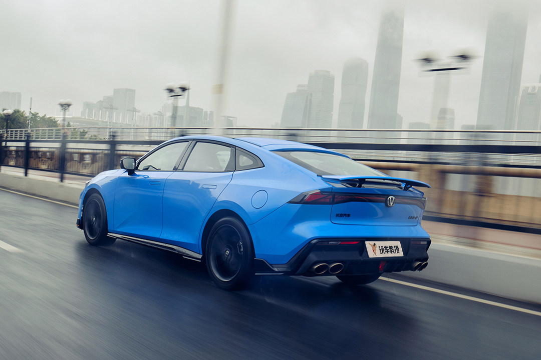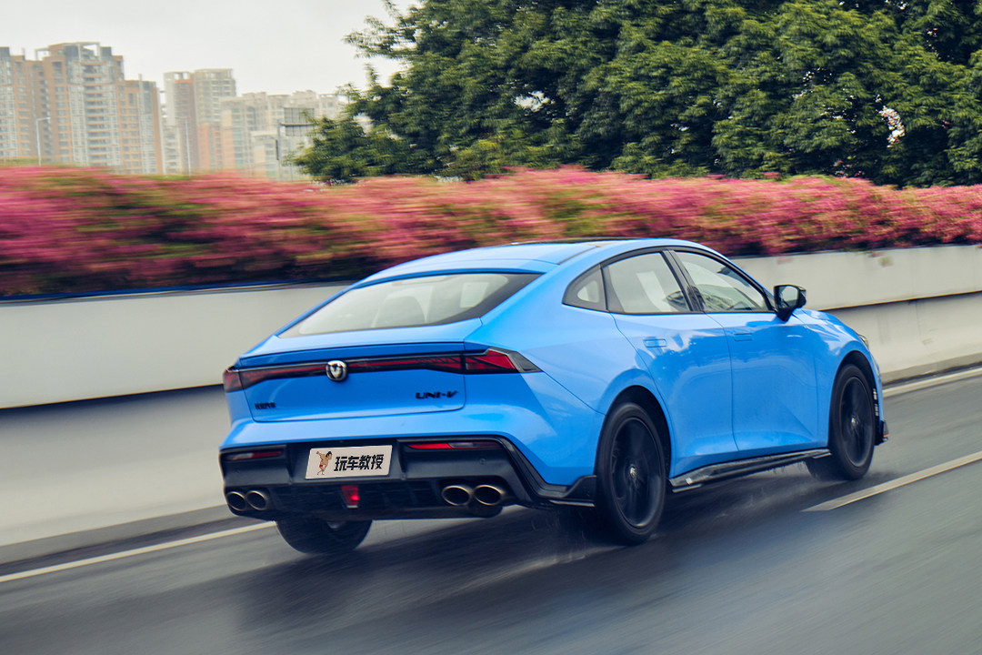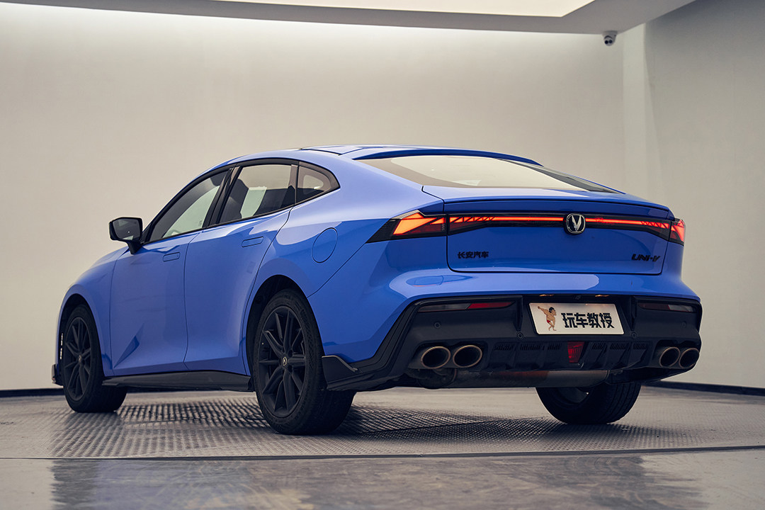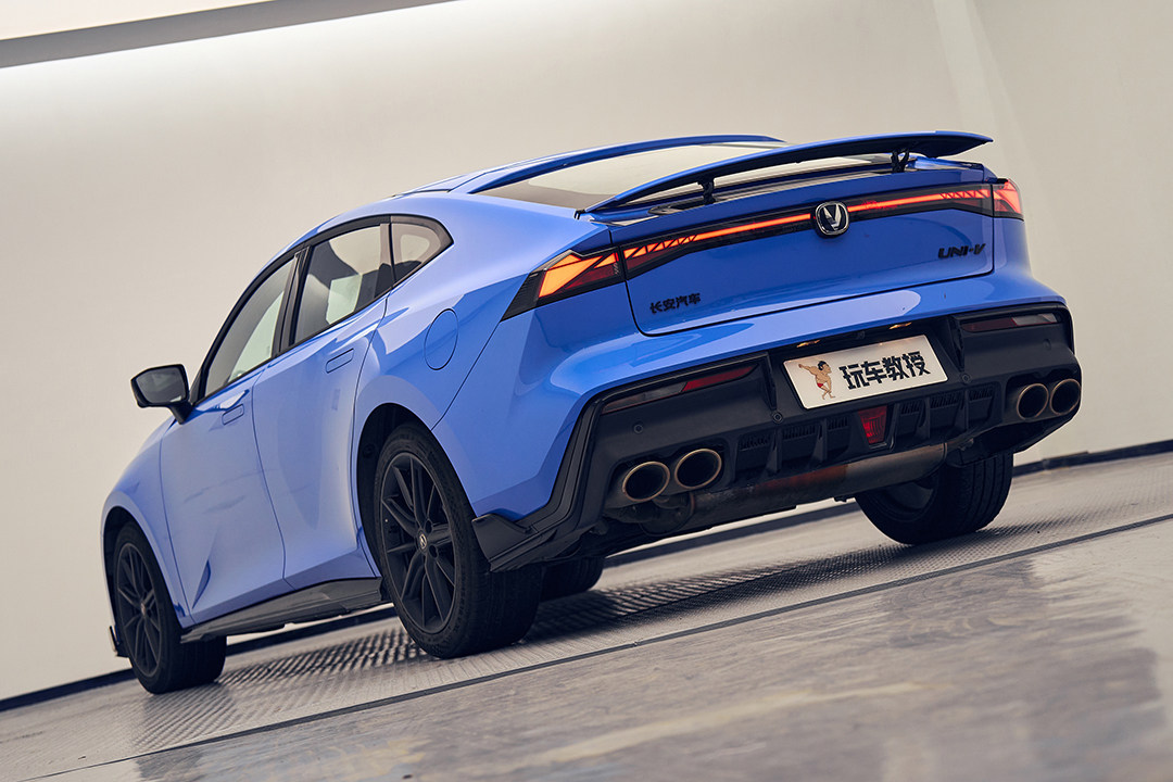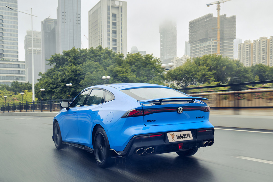 凌厉的折线、干练的形面、Fastback溜背造型、双边共四出式运动排气、电动升降尾翼;长安UNI-V拥有非常典型的运动轿跑设计风格。