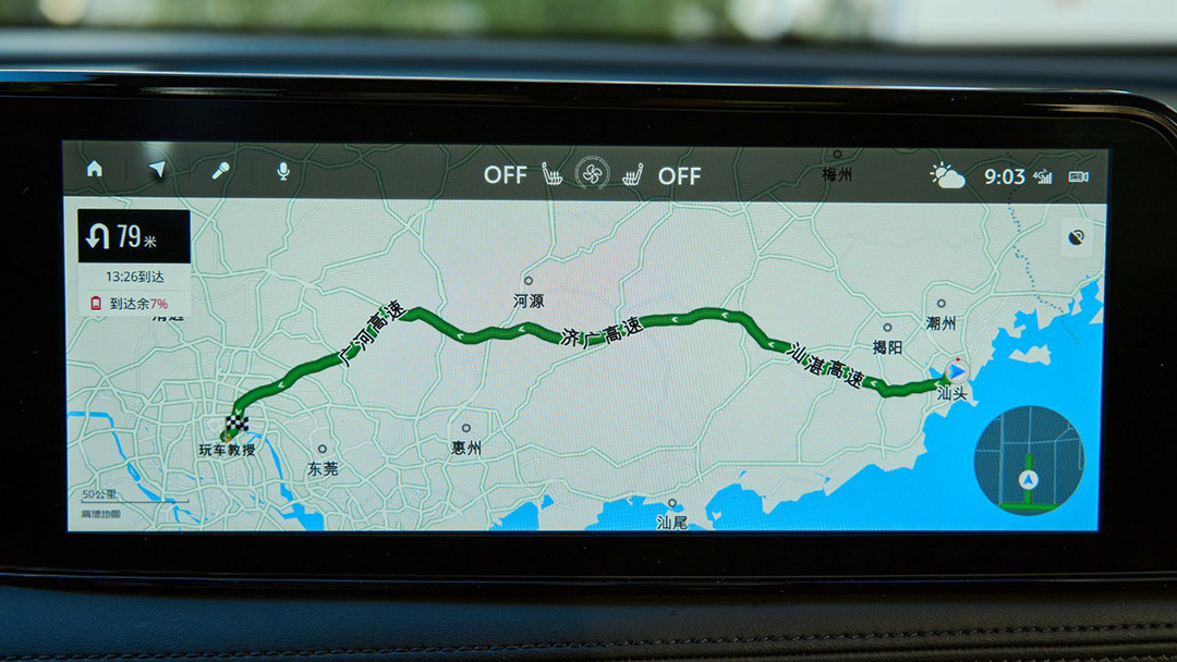 从汕湛高速到济广高速、广河高速,再到广州市区的华南快速,道路限速普遍在100-120km/h左右,正是电动车能耗较高的工况。