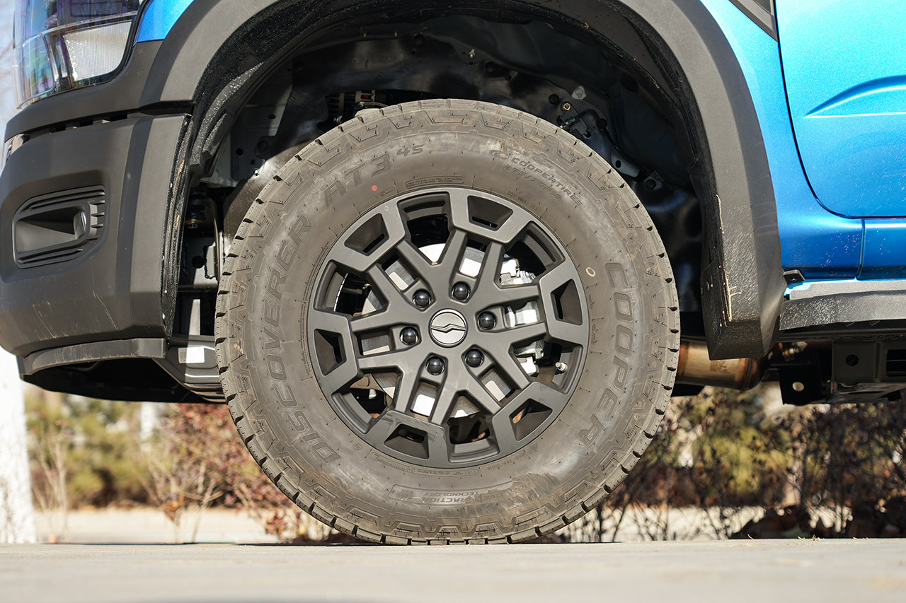 轮圈造型很年轻运动,而且这个哑光黑还挺有质感,配合庞大的车身和轮胎很厚的扁平比,这个18英寸的轮圈一点不显大。轮胎方面这台试装车选配备了固铂(Cooper)的DISCOVERER AT3 4S,这是一套很棒的四季全地形胎,尺寸为265/70 R18。