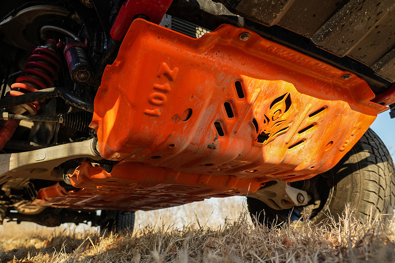 下方超大尺寸的加厚底盘护板也是竞技版的标配选项,完全覆盖了发动机和变速箱,采用了橙色涂装,前部还镂刻了图案,和外部拉花颜色很搭。