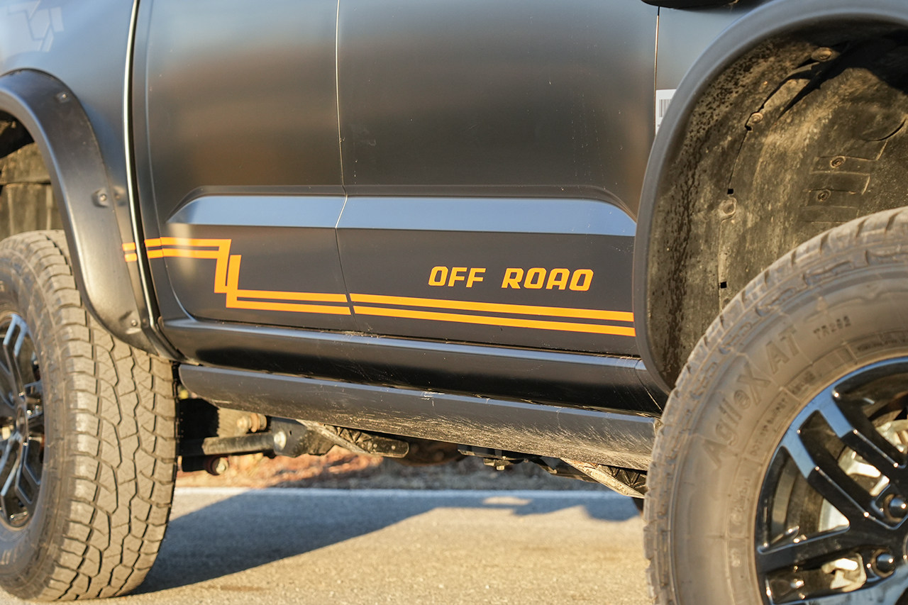 当然,1986竞技版这种宽体视觉效果只是“附带品”,如此设计的根本出发点是为了容下加宽后的轮距,1986竞技版前后轮距都达到了1730mm,比普通版车型提升了150mm,同级别皮卡之中根本找不到这么宽的轮距。至于视觉效果,以及防剐蹭,都只是“附送品”。