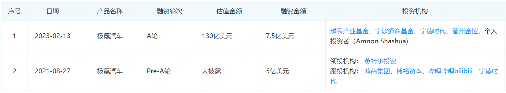 极氪早在2021年8月27日就曾宣布,英特尔资本、宁德时代、哔哩哔哩、鸿商集团和博裕投资等五家生态伙伴,正式签署战略投资协议。值得一提的是,英特尔在极氪的这次Pre-A轮融资中扮演的还是领投的角色。