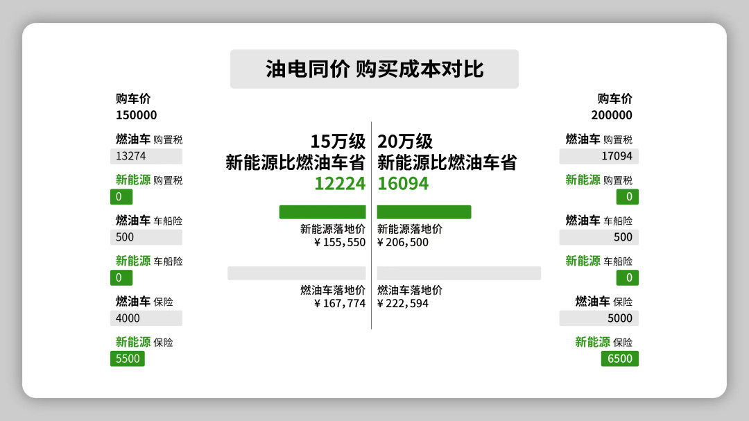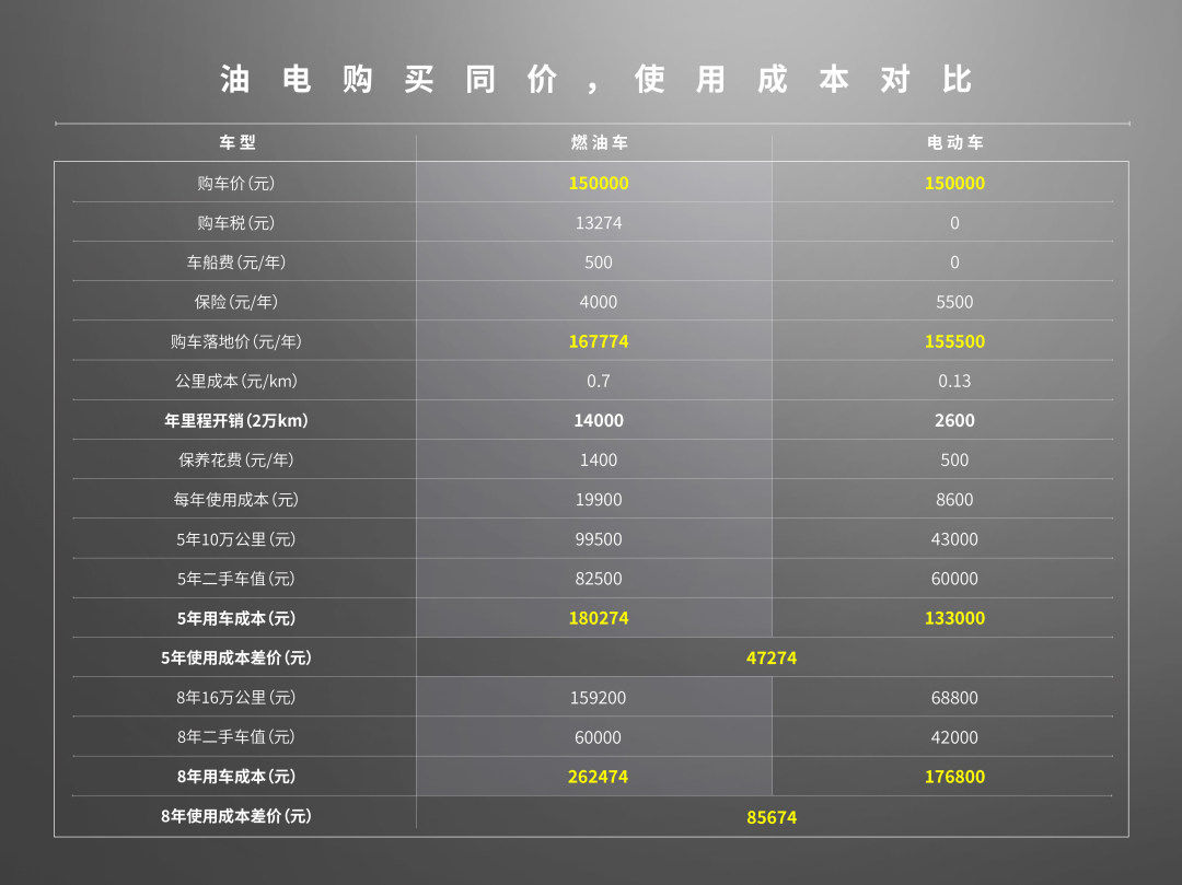 当然,如果你是不需要那么高的配置,仅只是想花最低的预算买到一台越级体验的中大型轿车,也可以不选配,算上保险、上牌费、车船使用费等,全款落地仅需15.76万元。如果是选装1.6万元的全配套装,其全款落地价在17.36万元左右,品价比超高。且值得一提的是,纯电动车的后续用车成本更低,每年比同价位油车省一万以上。