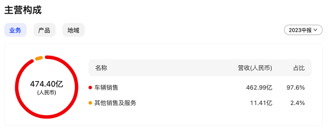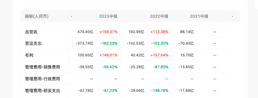 根据年报数据,理想汽车上半年同比总营收474.40亿元,同比增长159.31%,其中汽车销量占据97.6%的利润,而其他销售以及服务则是占据2.4%,后者也贡献出11.41亿元的收入。作为对比同事造车新势力的蔚来汽车总营收194.48亿元,小鹏汽车收入90.96亿元,遥遥领先于其他新势力品牌,也是理想有史以来最好的财报成绩,所以李想的狂真不是没有道理的,但也需要注意的是,理想汽车更多是通过高价格+不错销量达到的,营收较高是比较正常的现象。