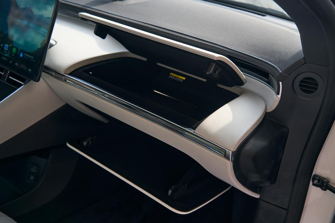 此外,智界S7车内储物空间的设计也给教授带来了不小的惊喜;除了常规的中央扶手储物箱、手套箱以及中控台下方的置物台,游艇座舱设计的中控台更通过平整的上层设计为用户带来一个非常实用的置物空间。