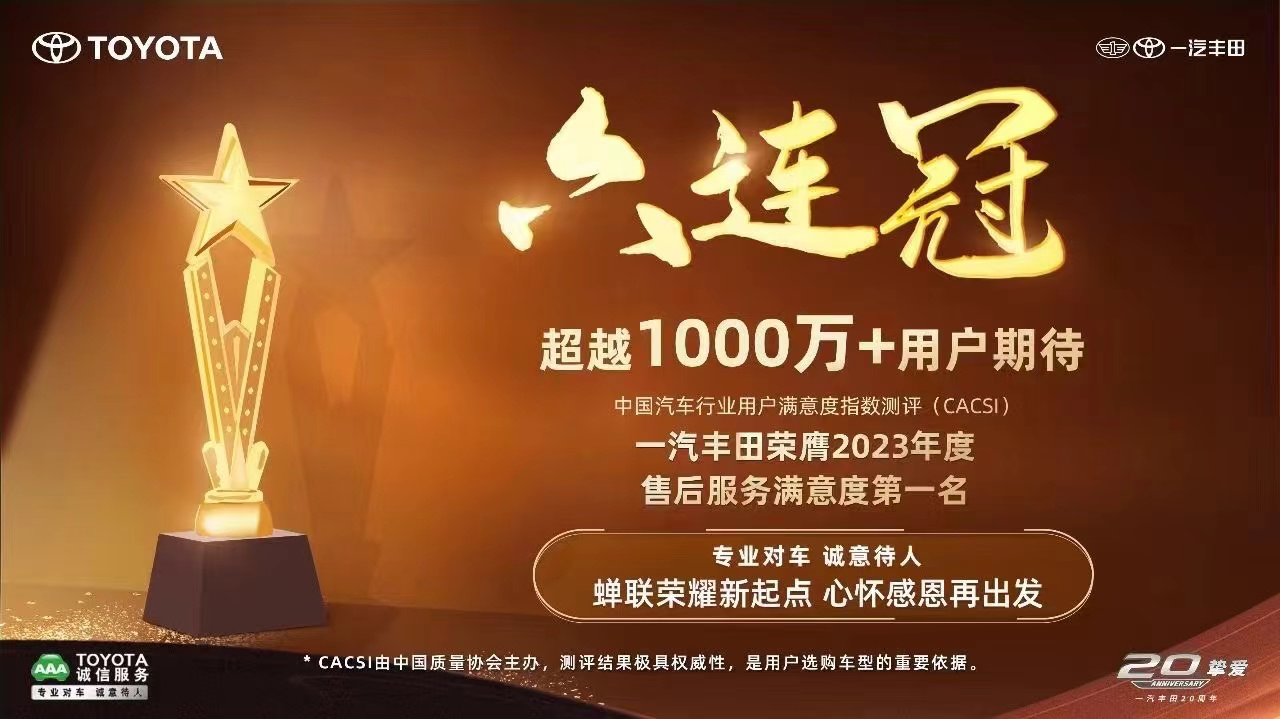 以近760家经销商为核心的强大线下服务布局,让一汽丰田无论何时何地都能快速为用户提供更便捷、更可靠、更安心的保障。2023年,整个汽车行业盈利能力大幅下降,而经销商由于普遍体量小、抗风险能力弱,面临较大经营和发展压力;为此,一汽丰田着重实现供需平衡,有效降低经销商压力,库存大幅低于行业平均水平。2024年,一汽丰田将通过变革组织机构、变革渠道、提升质量管理水平、调整供需等多方面持续为经销商减负,保障其健康、可持续发展。来自厂家的支持与关爱,激励着一汽丰田经销商爆发出更大的激情与势能,在2023年CACSI测评中,一汽丰田连续4年蝉联合资品牌销售、售后服务满意度双料冠军,售后服务满意度实现六连冠,且旗下卡罗拉、卡罗拉锐放、RAV4荣放、皇冠陆放、格瑞维亚均摘得各自细分市场桂冠,合计揽获七项冠军;并连续8年、累计9次获得“丰田服务全球金奖”。