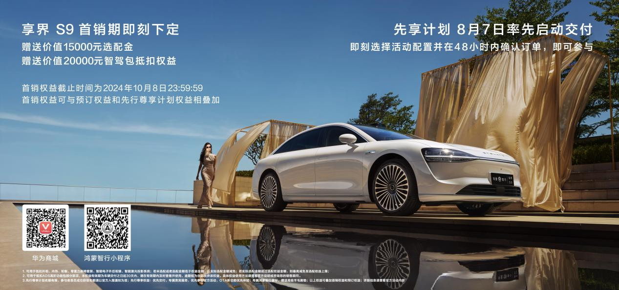 同时,鸿蒙智行针对享界S9的上市,还推出了车型专属的上市优惠政策。用户在首销期间下定,即可获赠价值15000元的选配金,以及价值20000元的智驾包抵扣权益,首销权益截止时间为2024年10月8日23:59:59。同时,首销权益可叠加预订权益和先行尊享计划权益。