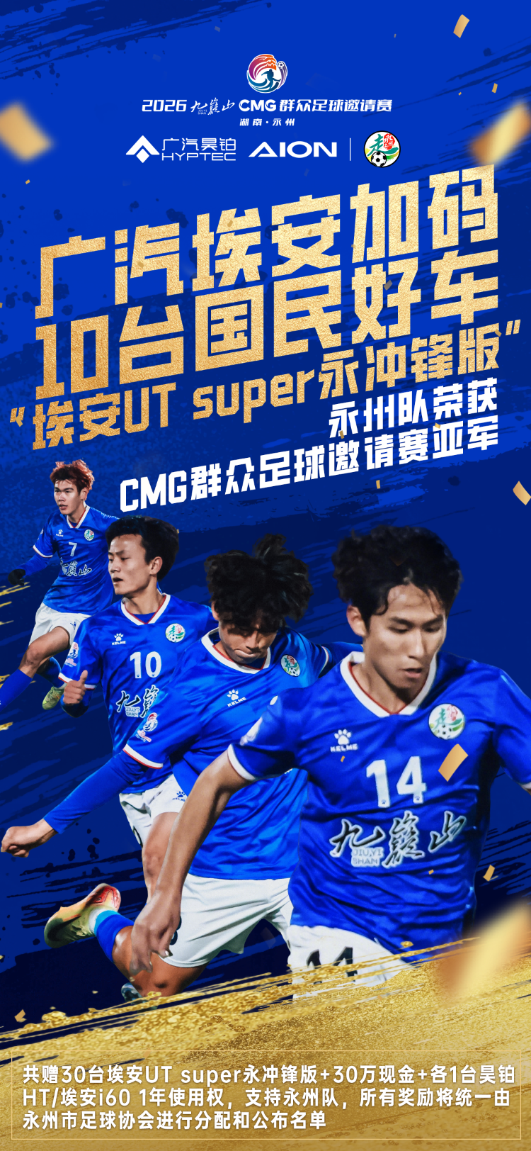 至此,广汽埃安承诺的奖励——总计30台埃安UT系列“永冲锋”版、30万元现金,以及昊铂HT、埃安i60各一年使用权,已完成大部分交付。剩余6台埃安UT系列“永冲锋”版,将于2026新赛季永州队主场作战时,通过抽奖形式回馈广大球迷。