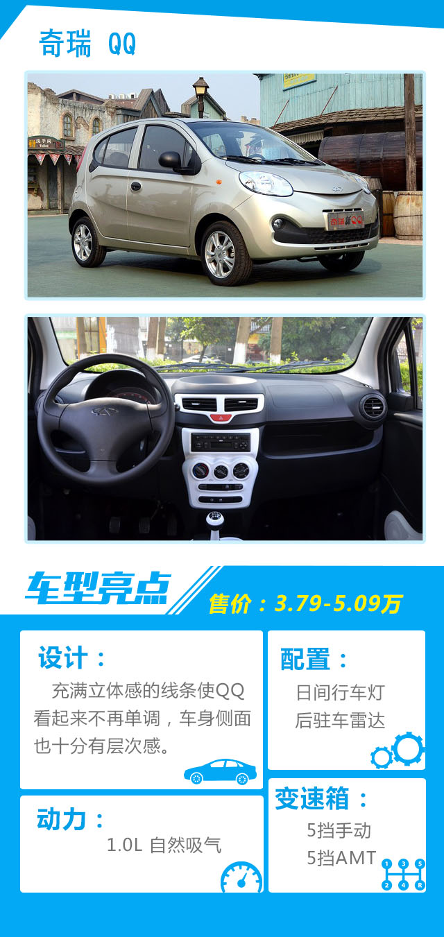 点评:现款的QQ外观一改老款车型圆润的造型,变得更加有立体感,比老款车型显得更加时尚,而且车内空间也要大出很多。如果你开着一辆QQ上路,隔着很远大部分人都可以认出你的的座驾是一辆可爱的QQ。虽然后备箱的储物空间有些不足,但是它毕竟只是一辆代步通勤车,而不是一辆用来拉货的“面包车”。