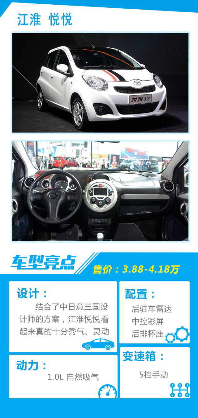 点评:作为一台专用于城市代步使用的微型车,1.0L自然吸气发动机装载在悦悦身上已经足够,而且江淮悦悦凭借着秀气灵动的外观、简洁顺手的内饰设计和丰富的配置,着实让它的竞争对手们都捏了一把冷汗。但是在做工细节方面还有一定的提升空间,如果能将这方面再加强一点,小编觉得在路上碰到它的几率将会大大增加。