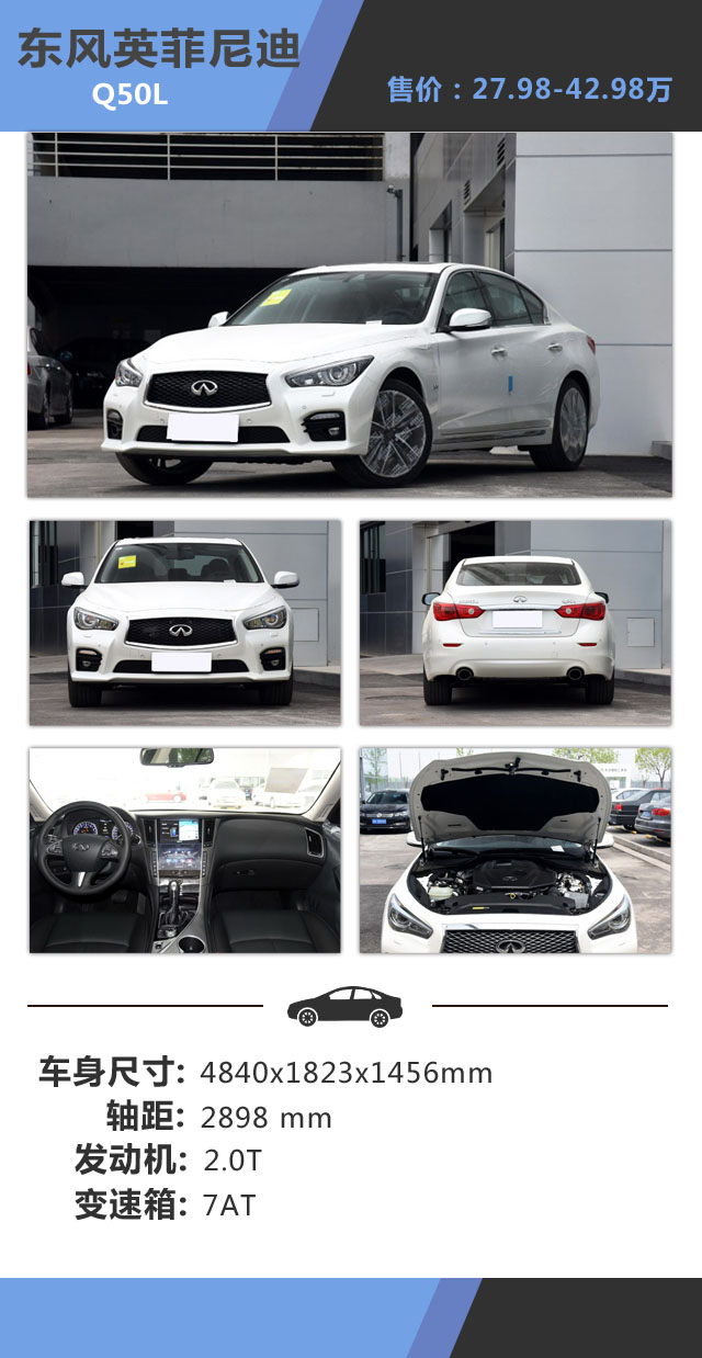 Q50L全系搭配了2.0T发动机,整体的表现还是不错的,其调校主要偏向于运动化,短促的悬挂行程,很敏感的油门设计加上精准的方向盘都会带来很不错的驾驶感受,假如搭配的7AT换挡逻辑更好的话,那就更完美了。