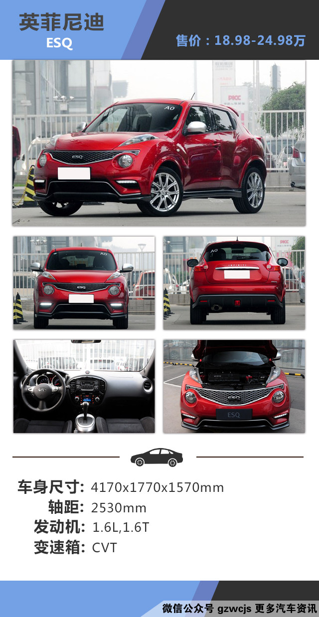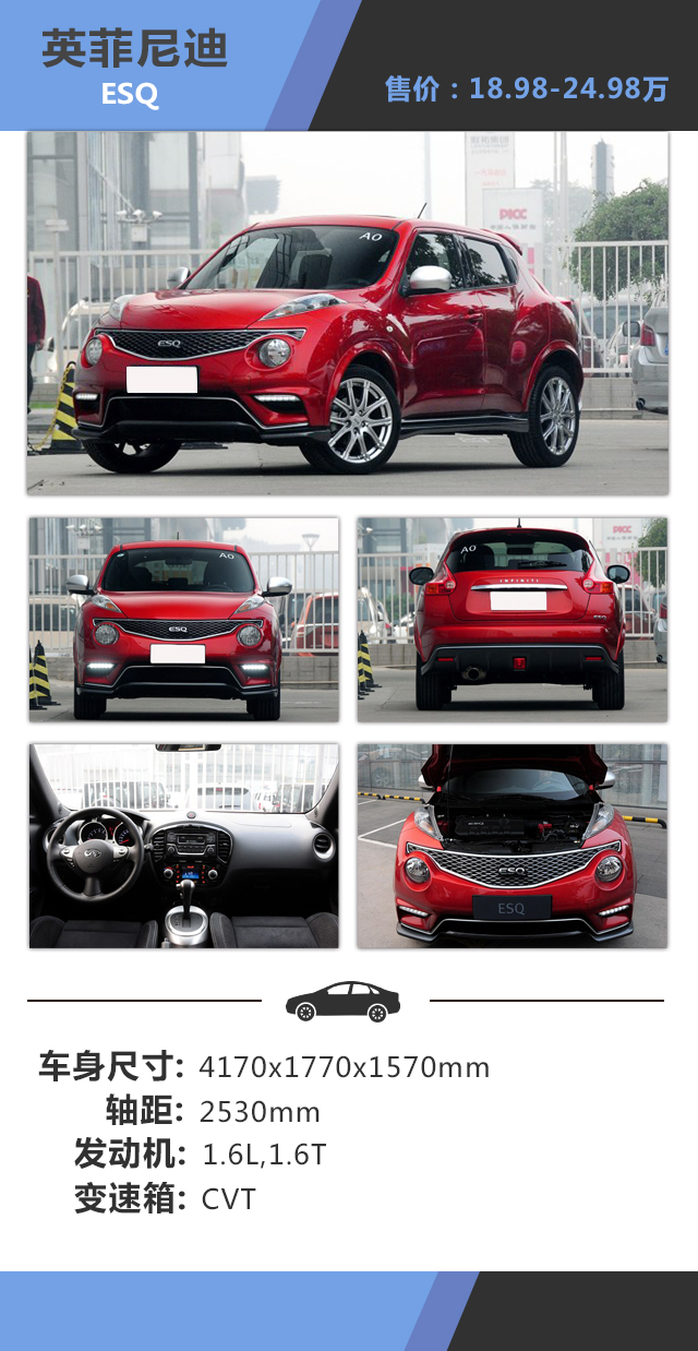 教授点评:教授觉得ESQ就是一个怪物,不知道有多少人有同感呢,其原本只是日产的JUKE,只是进中国后挂了英菲尼迪标,当然价格也相对高了很多,逼格会提高多少呢,可能只有买了它的人才会知道。不过确实其个性奇特的外观开在路上绝逼可以收获满满的回头率,至于车内其用料比较一般,缺少豪华感,不过目前终端市场优惠颇大,可以较低的价格买到一辆英菲尼迪的个性车还是挺划算的。