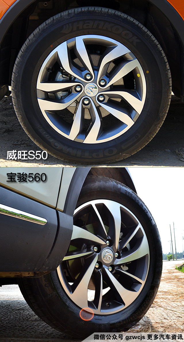 威旺S50采用韩泰OPTIMO H426轮胎,轮胎尺寸为225/60 R17,宝骏560采用马牌CPC5系列轮胎,尺寸为215/60 R17。两车的轮毂都采用双五幅式设计,威旺S50呈现力量感,而宝骏560更显锋利。