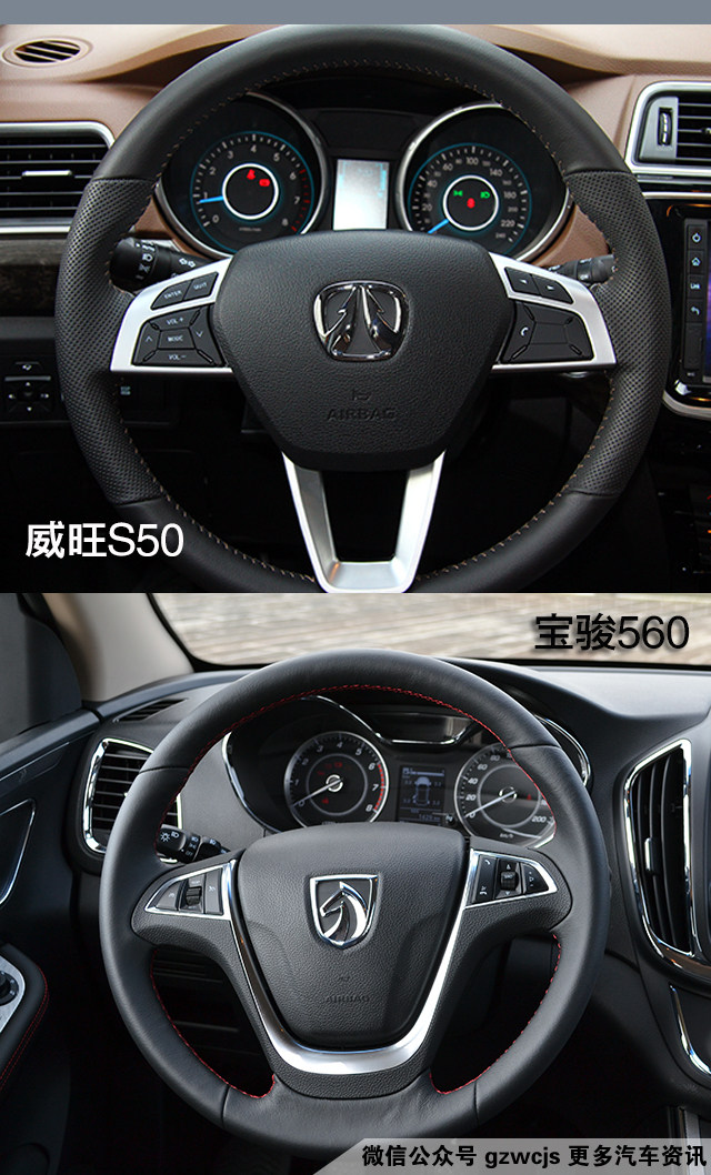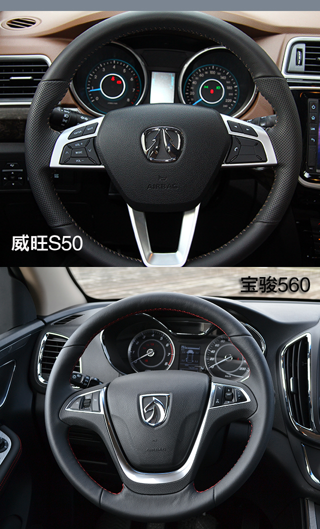 两车都采用三幅式真皮方向盘,都集成了行车信息、多媒体控制、蓝牙电话等功能,宝骏560还配置了定速巡航功能。不同的是威旺S50配置了方向盘上下左右四向调节,而宝骏560只有上下两向调节。