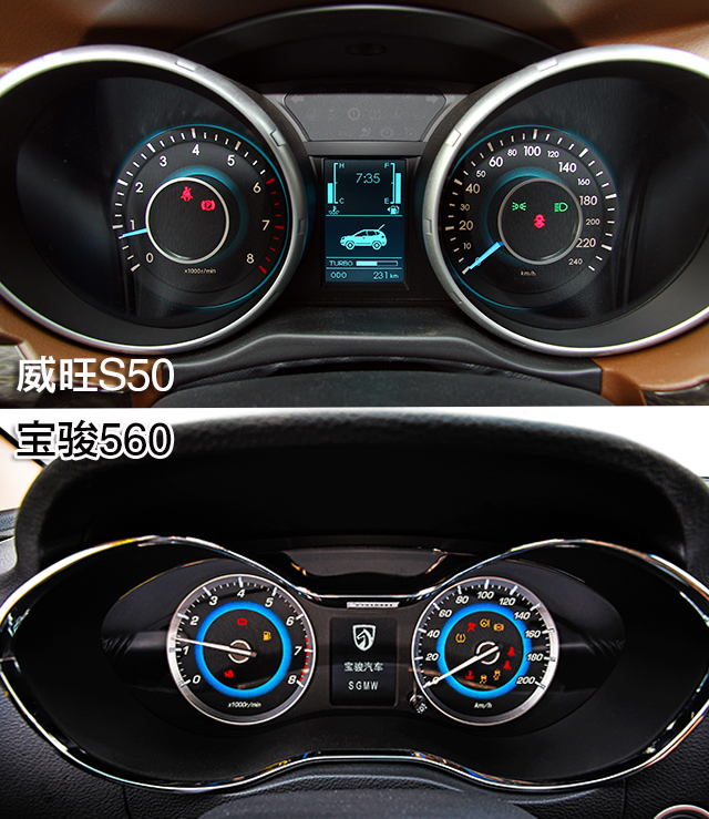 威旺S50的仪表盘采用双炮筒设计,与整体的运动气息符合。宝骏560的仪表盘则使用平铺式设计。两车仪表盘均配置了单色液晶屏。