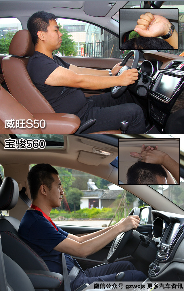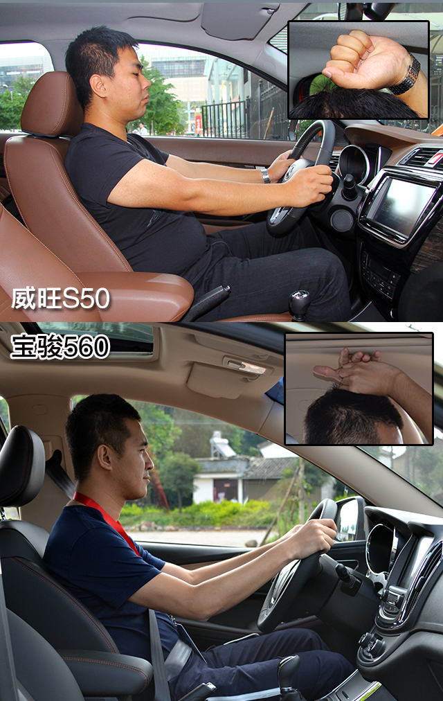 身高同样为175cm的体验者,分别坐入威旺S50和宝骏560,头部空间都在一拳左右。